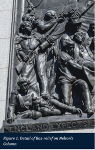 At the base of Nelson’s column, on the left-hand side of the bronze bas-relief which faces Whitehall and depicts the Battle of Trafalgar, there is depicted a black sailor armed with a musket. Along with a neighbouring Royal Marine who is taking aim, and another sharp-eyed sailor pointing aloft, he appears focussed on returning fire at the unseen sniper who has just felled Nelson (Fig. 1). Naval Review readers may be familiar with this figure, but the general public is probably not. He was highlighted as part of our nation’s ‘forgotten history’ by historian David Olusoga in his book ‘Black and British’1Olusoga, D. (2016) Black and British. A Forgotten History. London: Pan Macmillan. and in his associated BBC TV series of 2016. The figure was also mentioned by journalist Afua Hirsch in a 2017 Guardian article in which she advocated removal of the monument for Nelson’s alleged sin of ‘white supremacy’.2https://www.theguardian.com/commentisfree/2017/aug/22/topplingstatues-nelsons-column-should-be-nextslavery In her article, Hirsch railed against the absence of context for the depiction: