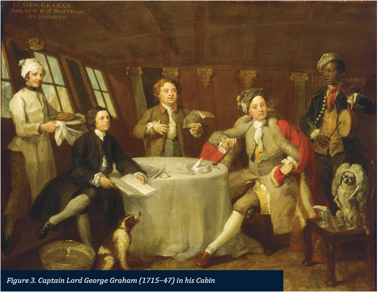 The bronze figure on Nelson’s column is clear evidence that black sailors haven’t been ‘erased’ from the artistic record. Black lives in British society were first depicted in the 17th century when black slaves began to be included in portraits commissioned by their wealthy owners, long before most people in Britain would have seen a black person in the flesh.10‘Slave’ is used here instead of ‘servant’ given the nature of the relationship and the conditions under which such individuals usually served, although slavery was never codified in English law. Wealthy naval officers followed this artistic fashion, and in doing so recorded some of the first black faces at sea in the Royal Navy. Captain Lord George Graham (Fig. 3) and Lieutenant Paul Henry Ourry (Fig. 4) were both painted with their black slaves in the mid-18th century.11William Hogarth. Captain Lord George Graham in his Cabin. Oil on canvas (1745). National Maritime Museum BHC2720, Lieutenant Paul Henry Ourry, MP (1719-1783) with ‘Jersey’. Joshua Reynolds. Oil on canvas (circa 1748). National Trust, Saltram, Devon. For excellent online resources on slavery and portraiture in 18th Century Britain see https://britishart.yale.edu/exhibitions-programs/figures-empire-slavery-and-portraitureeighteenth-century-atlantic-britain. Black figures like these were initially anonymous status symbols, but by the end of the century they had migrated from the margins of art to be depicted as central figures, just as slavery had become a central feature of political and religious debate in Britain.