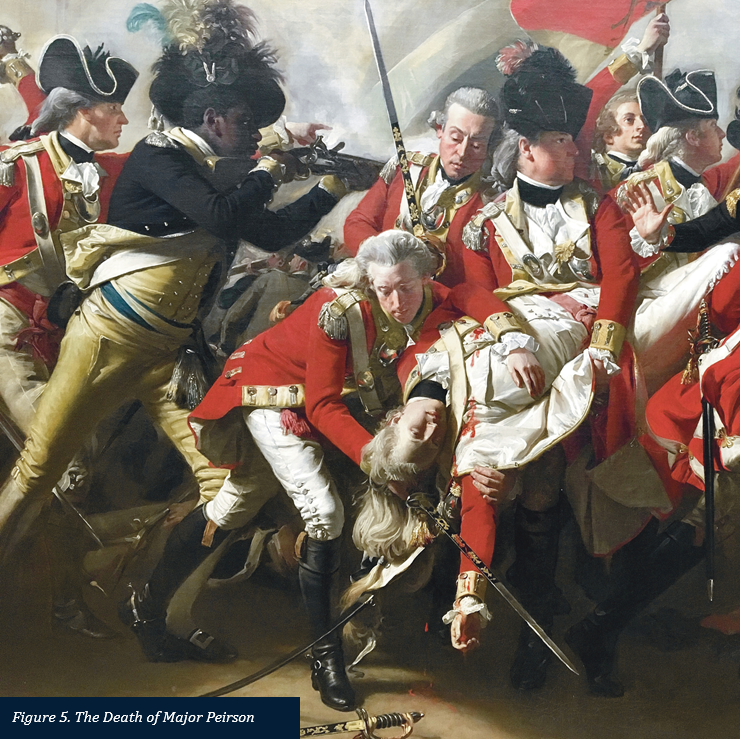 Carew’s bronze on Nelson’s column was undoubtedly influenced by another famous depiction of a black military servant: John Singleton Copley’s 1783 painting ‘The Death of Major Peirson’ (Fig. 5) daringly placed at its heart an armed black servant exacting revenge for the death of the eponymous hero.12Tate Britain N00733. Copley altered actors and events to make his painting more popularly resonant and commercially attractive. Although the painting was promoted as showing Peirson’s free black servant avenging his master, Pierson himself didn’t actually have a black servant. There is anecdotal evidence that one of the free black servants of another officer did play a part in the engagement and may have avenged Peirson (either Abraham Allec or Isaac Burton, most likely the latter). See Kamensky, J. (2016) A Revolution in Color: The World of John Singleton Copley. New York and London: Norton, pp.316–27 and Saunders, G H. (1990), ‘Genius and Glory: John Singleton
